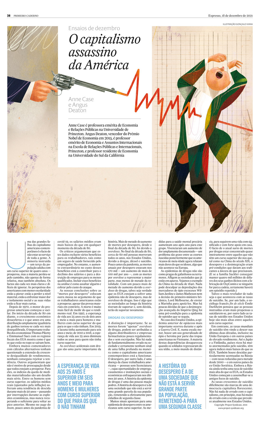 Expresso. America's killer capitalism. For an essay by Anne Case and Angus Deaton - "Faced with data showing a long-term decline in wages alongside rising inequality and "deaths of despair," apologists for the status quo tend to rely on several arguments to explain away the problem. None of them withstands scrutiny".