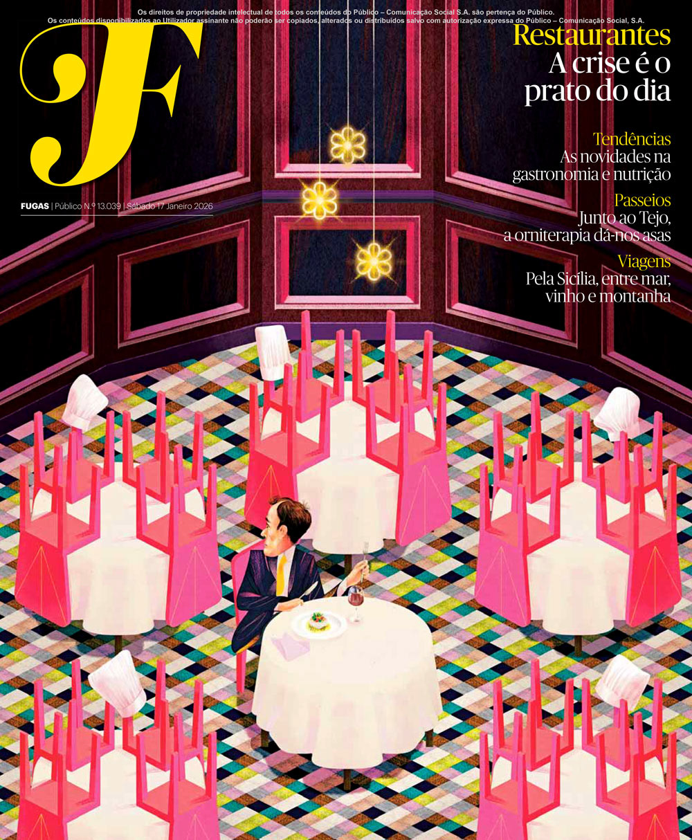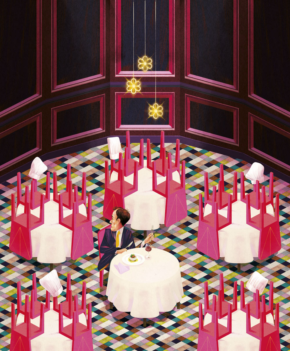 Público. Supplement cover illustration about the fine dining crisis in Portugal, where haute cuisine restaurants are facing a large decline in costumers while having to balance soaring costs and very large staffs.